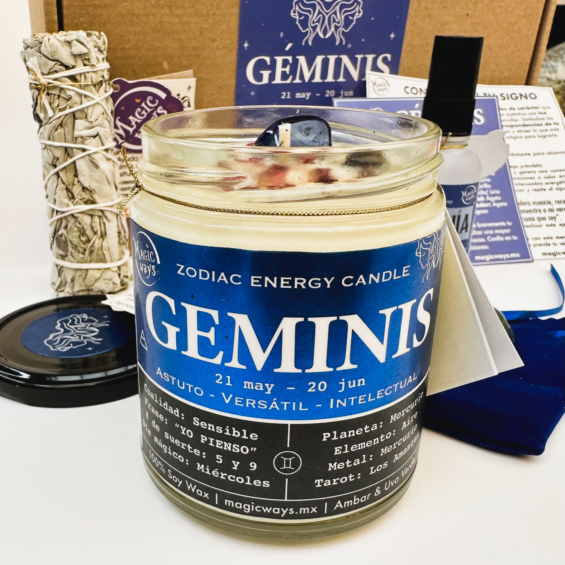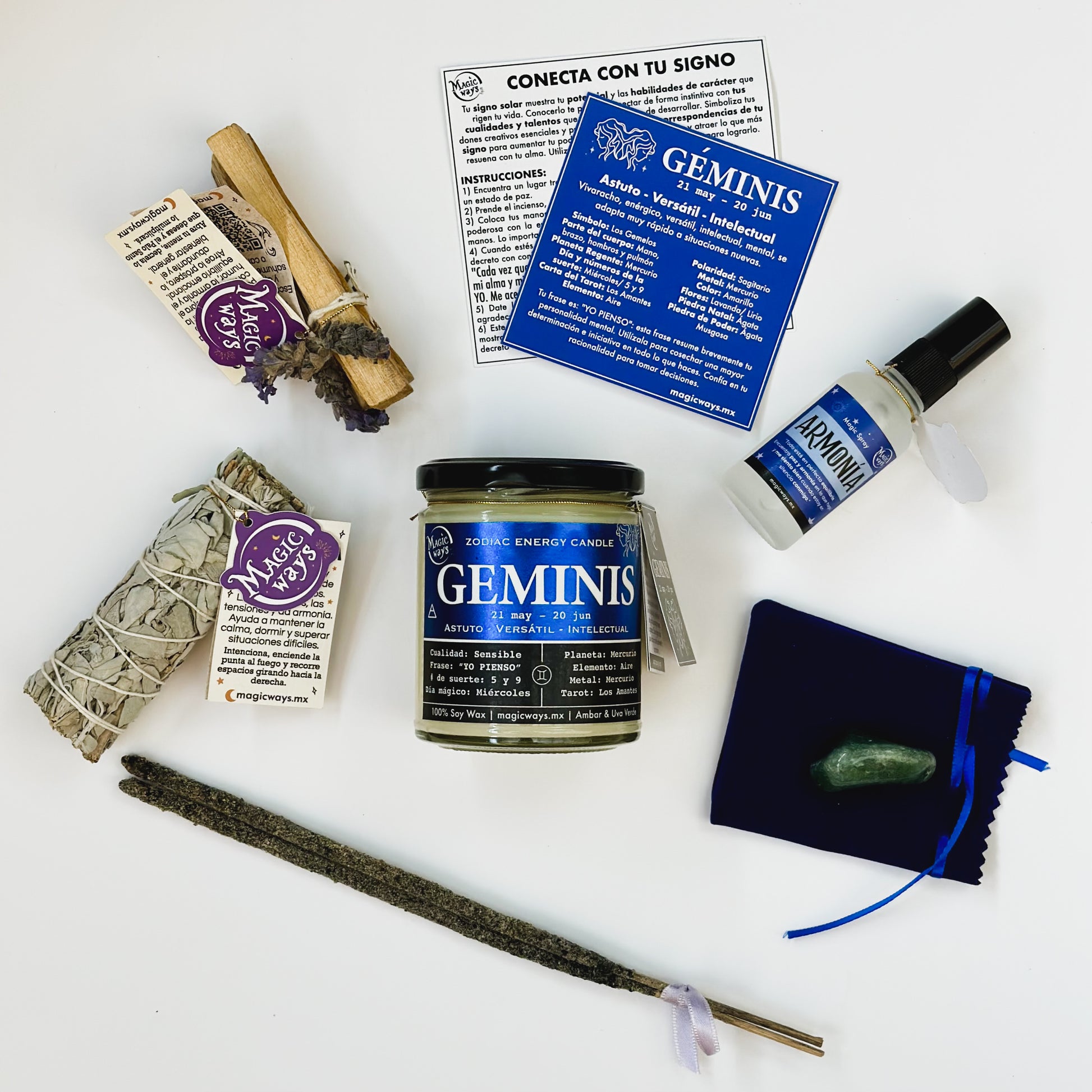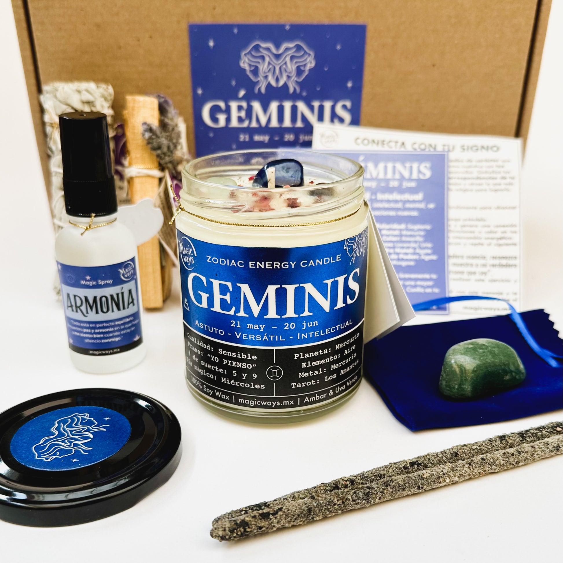 Esta caja está diseñada para potenciar aquellas cualidades y habilidades de tu signo solar. Te permitirá conectar con la esencia profunda, innata y exclusiva de la constelación Gemini (nacidos entre el 21 de mayo y el 20 de junio). Incluye su piedra de poder, sahumerios para manifestar abundancia (palo santo) y cambiar la energía (salvia) y un spray diseñado para que los geminianos encuentren estabilidad, equilibrio y paz interior ante todo ese ruido mental.