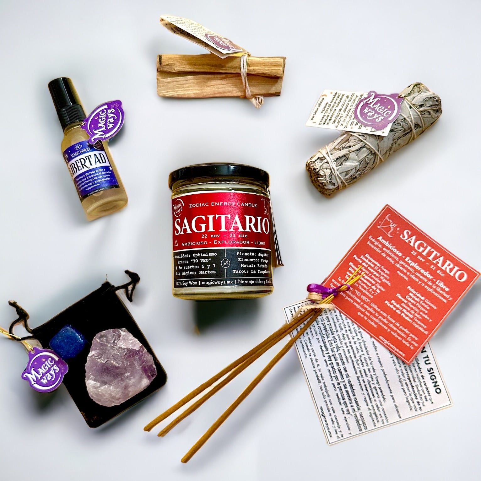 Esta caja está diseñada para potenciar aquellas cualidades y habilidades de tu signo solar. Te permitirá conectar con la esencia aventurera, enérgica y en búsqueda de nuevos retos que es innata y exclusiva de la constelación de SAGITARIO (nacidos entre el 22 de noviembre y el 21 de diciembre ). Incluye un cuarzo de poder, sahumerios para manifestar abundancia (palo santo) y cambiar la energía (salvia) y un spray mágico diseñado para conectar con su necesidad de LIBERTAD.
