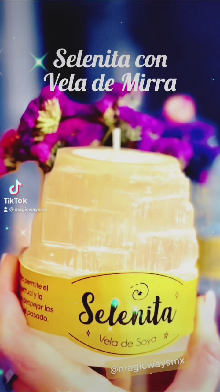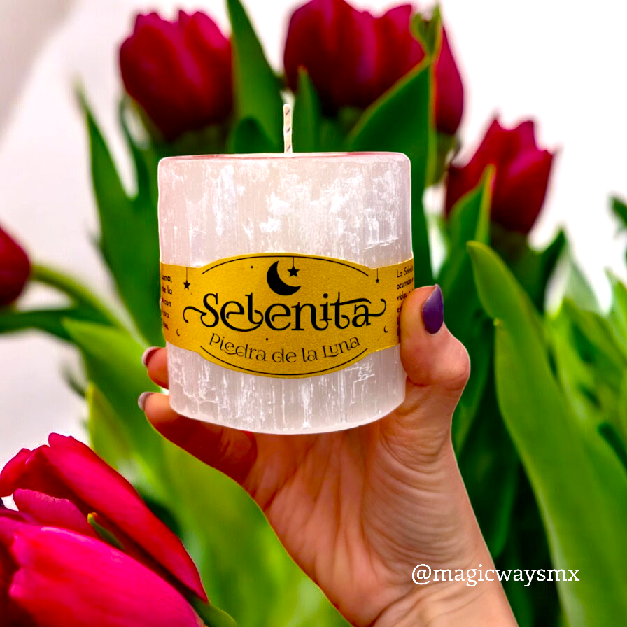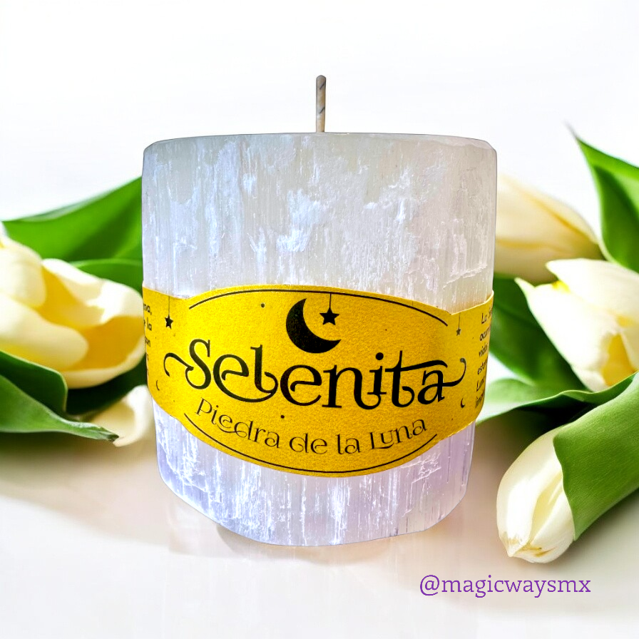 🌟 Vela de Soya (50g) aroma a Flores Lunares. Activa el sanador interno. DURACIÓN: más de 6 horas (continuas).La Selenita representa la Luna.
